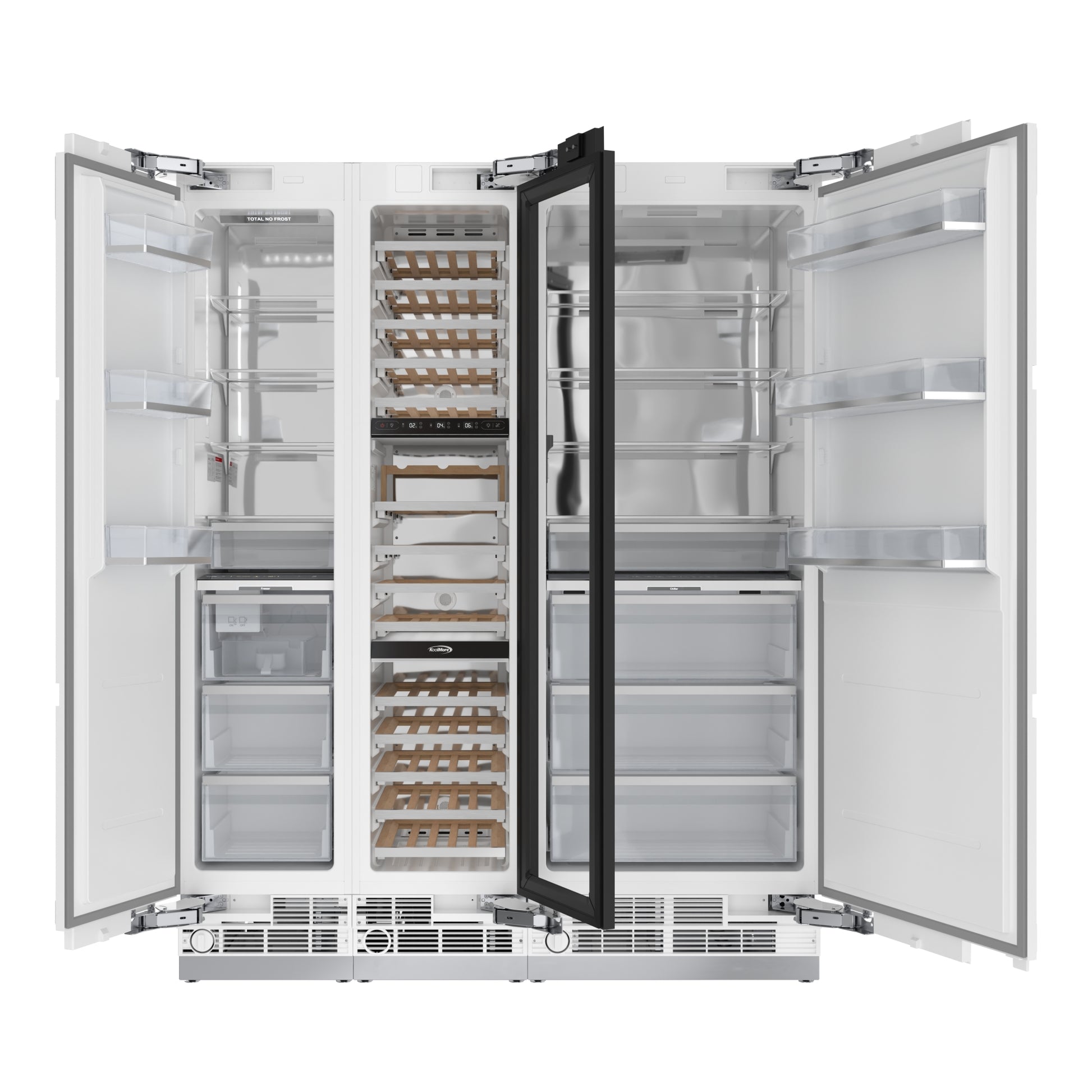 With a combined capacity of 34.2 cu. ft., this set offers ample storage for all your needs: the refrigerator provides 16.6 cu. ft. with three adjustable glass shelves, four soft-close drawers, and three door bins, including one gallon-sized; the freezer adds 8.6 cu. ft. with three adjustable shelves, four soft-close drawers, and three spacious door bins; and the wine cooler accommodates up to 68 bottles across 14 wooden shelves with precision cooling.