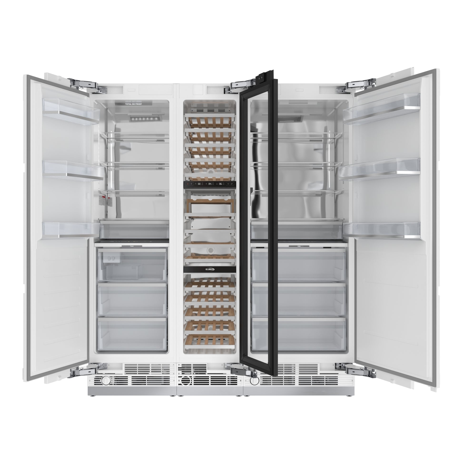 With a combined capacity of 38 cu. ft., this set offers ample storage for all your needs: the refrigerator provides 16.6 cu. ft. with three adjustable glass shelves, four soft-close drawers, and three door bins, including one gallon-sized; the freezer adds 12.4 cu. ft. with three adjustable shelves, four soft-close drawers, and three spacious door bins; and the wine cooler accommodates up to 68 bottles across 14 wooden shelves with precision cooling.
